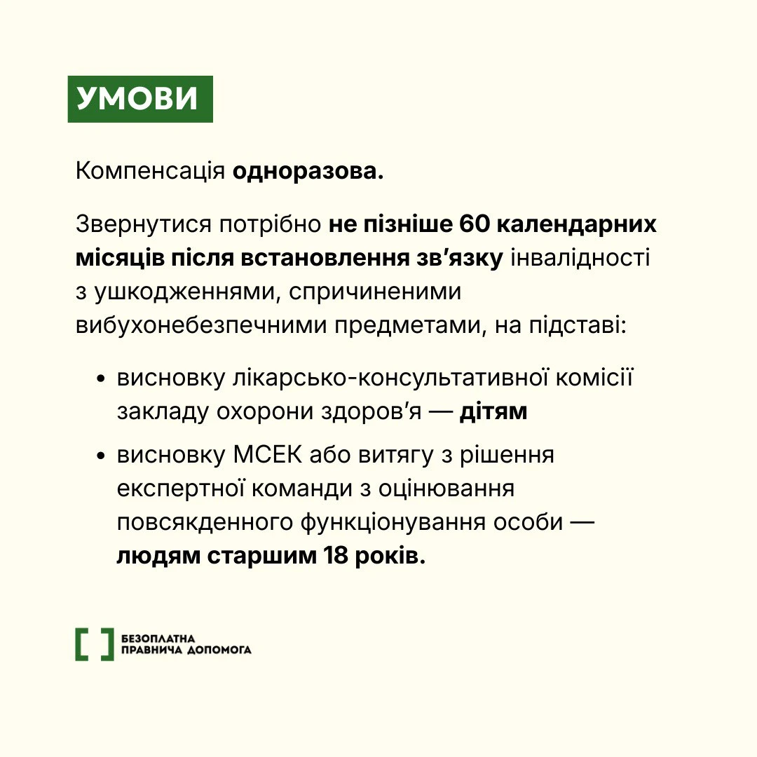 Якщо інвалідність виникла через ушкодження від вибухонебезпечних предметів, держава передбачає одноразову компенсацію.